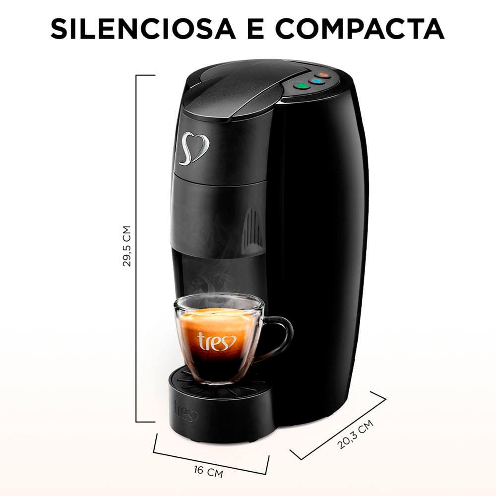 Com a Cafeteira TRES Lov de Espressos e Multibebidas você vai desfrutar de um café perfeito a qualquer hora do dia! Esta máquina automática oferece extrações silenciosas e rápidas para preparar diversas bebidas, como café espresso, café filtrado, cappuccino, café com leite e chás, com apenas um toque no botão.