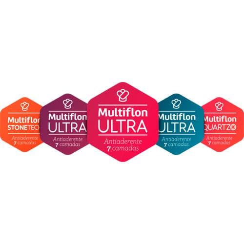 Produzida em alumínio certificado (99,7% de pureza), garantia de que não há metais pesados em sua composição e revestida com exclusivo ANTIADERENTE MULTIFLON ULTRA7, desenvolvido para uso nos produtos Multiflon®, ULTRA7 é um revestimento antiaderente extremamente resistente estudado para uso superintenso, o selo ULTRA7 é garantia de alta qualidade em antiaderência e resistência, livre de PFOA.