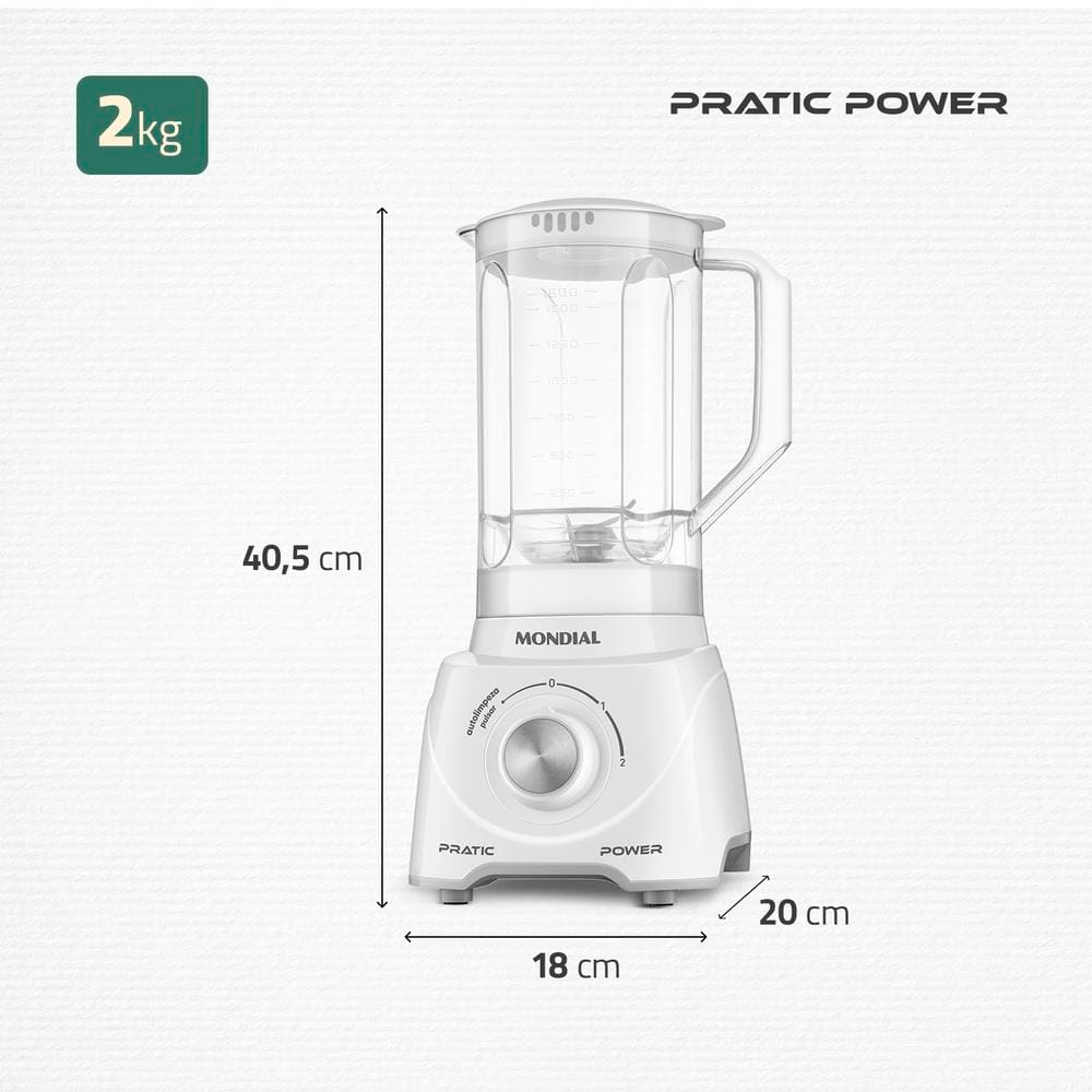 O Liquidificador L97W da Mondial, produzido em polipropileno, oferece resistência a quedas e arranhões, garantindo maior proteção e durabilidade. Sua jarra possui capacidade útil de 1,6 litros, ideal para preparar grandes quantidades de bebida de uma única vez.