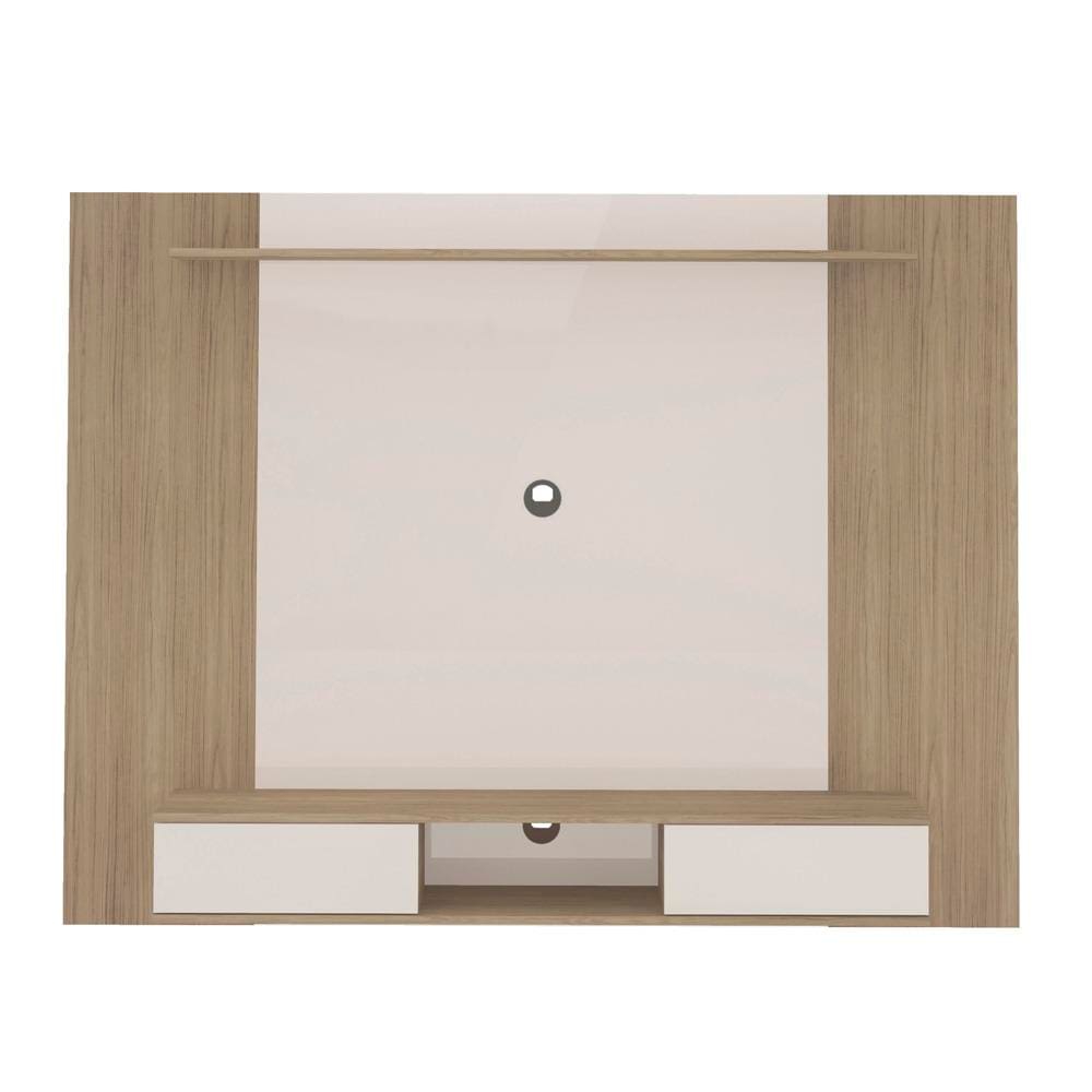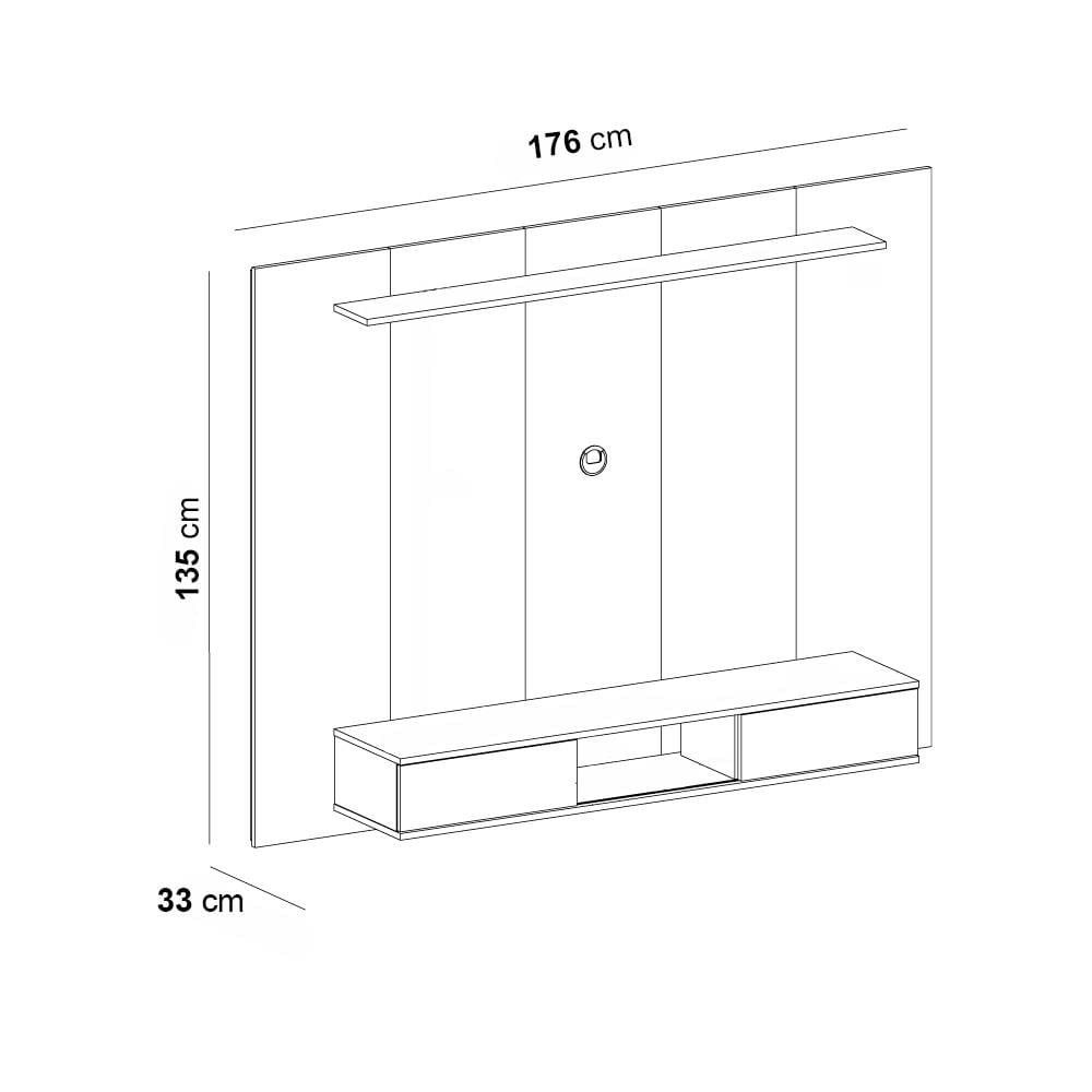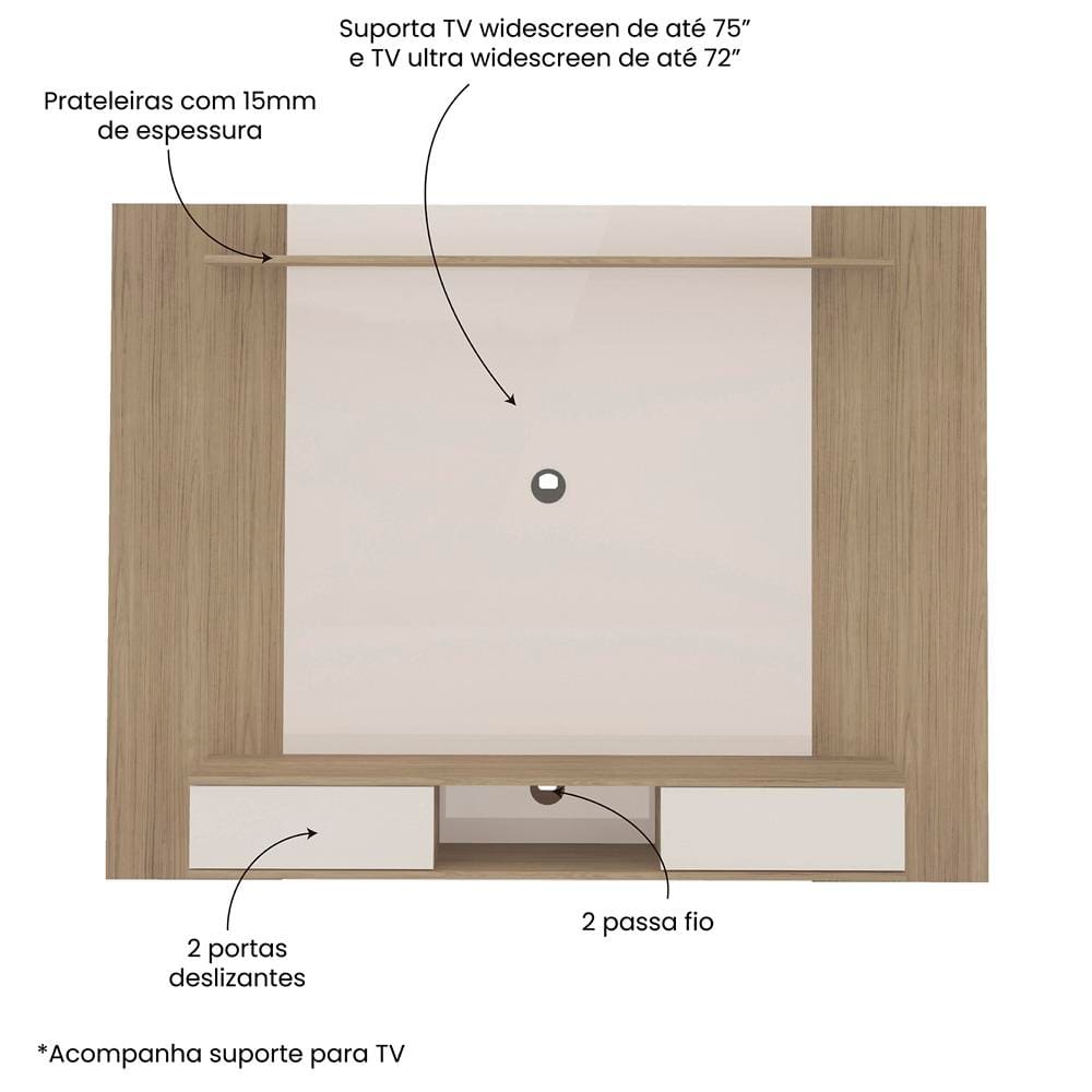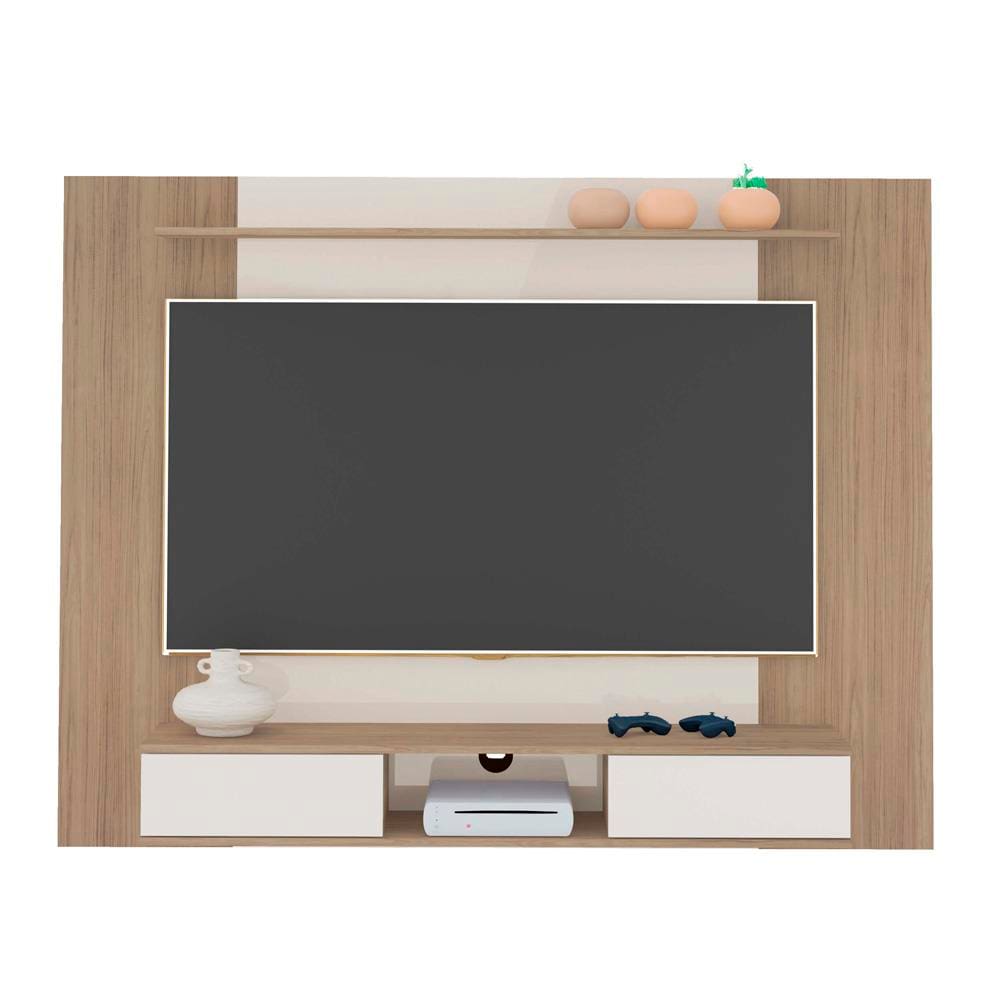 O painel conta com uma prateleira superior que é ideal para expor itens decorativos, dando personalidade ao ambiente. Além disso, o nicho central oferece espaço para dispositivos eletrônicos, deixando tudo ao seu alcance de forma organizada e acessível.