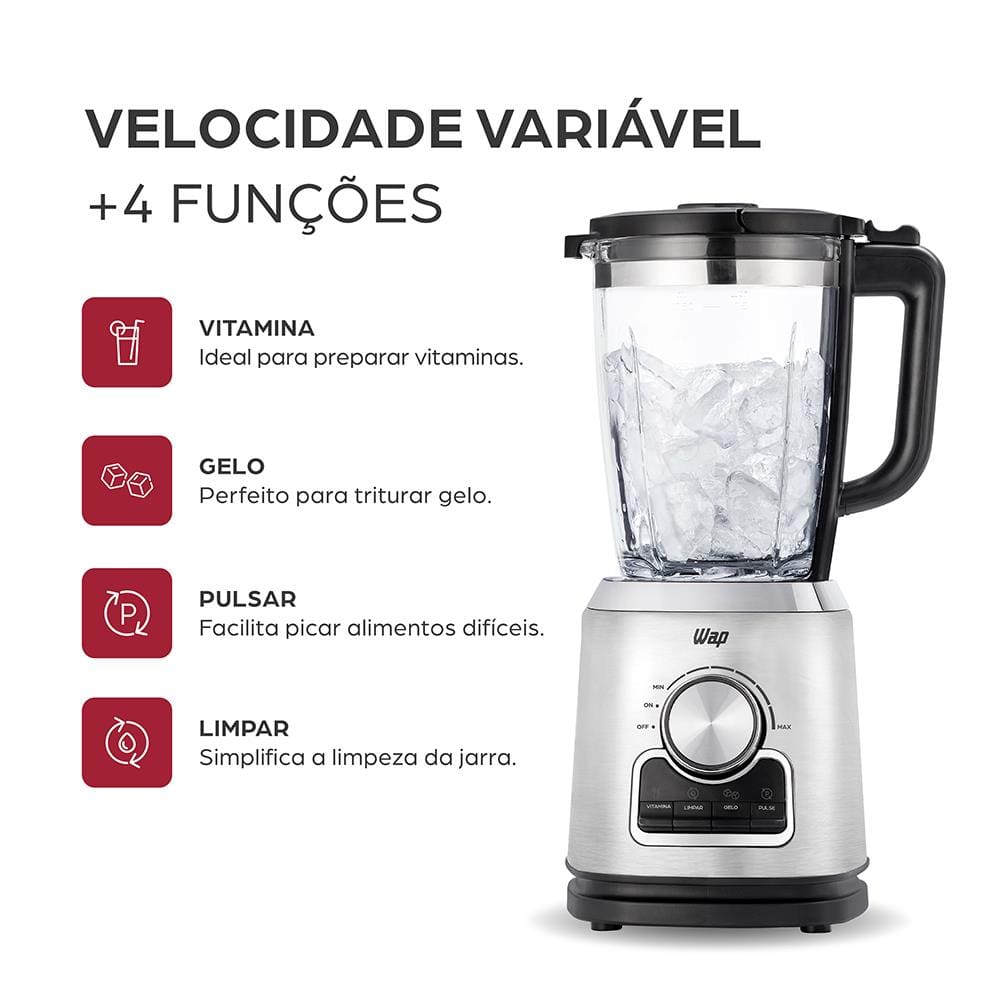 Equipado com lâminas serrilhadas em aço inox, o WB2000 tritura com facilidade desde frutas delicadas até cubos de gelo, garantindo resultados precisos e consistentes. As lâminas são removíveis, o que facilita a limpeza após o uso. O liquidificador oferece controle de velocidade variável e quatro funções pré-programadas: Vitamina para smoothies, Pulsar para ingredientes mais duros, Gelo para triturar com eficiência e Limpar, que simplifica a manutenção do aparelho.