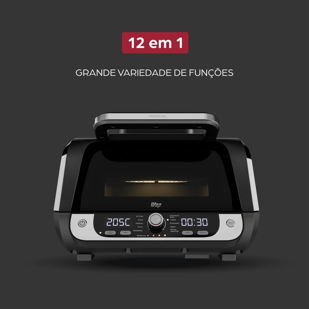 Com 12 funções automáticas e painel digital com display LED, ela oferece uma experiência intuitiva e moderna para preparar receitas crocantes, grelhadas ou suculentas, como se estivessem saindo direto da churrasqueira.