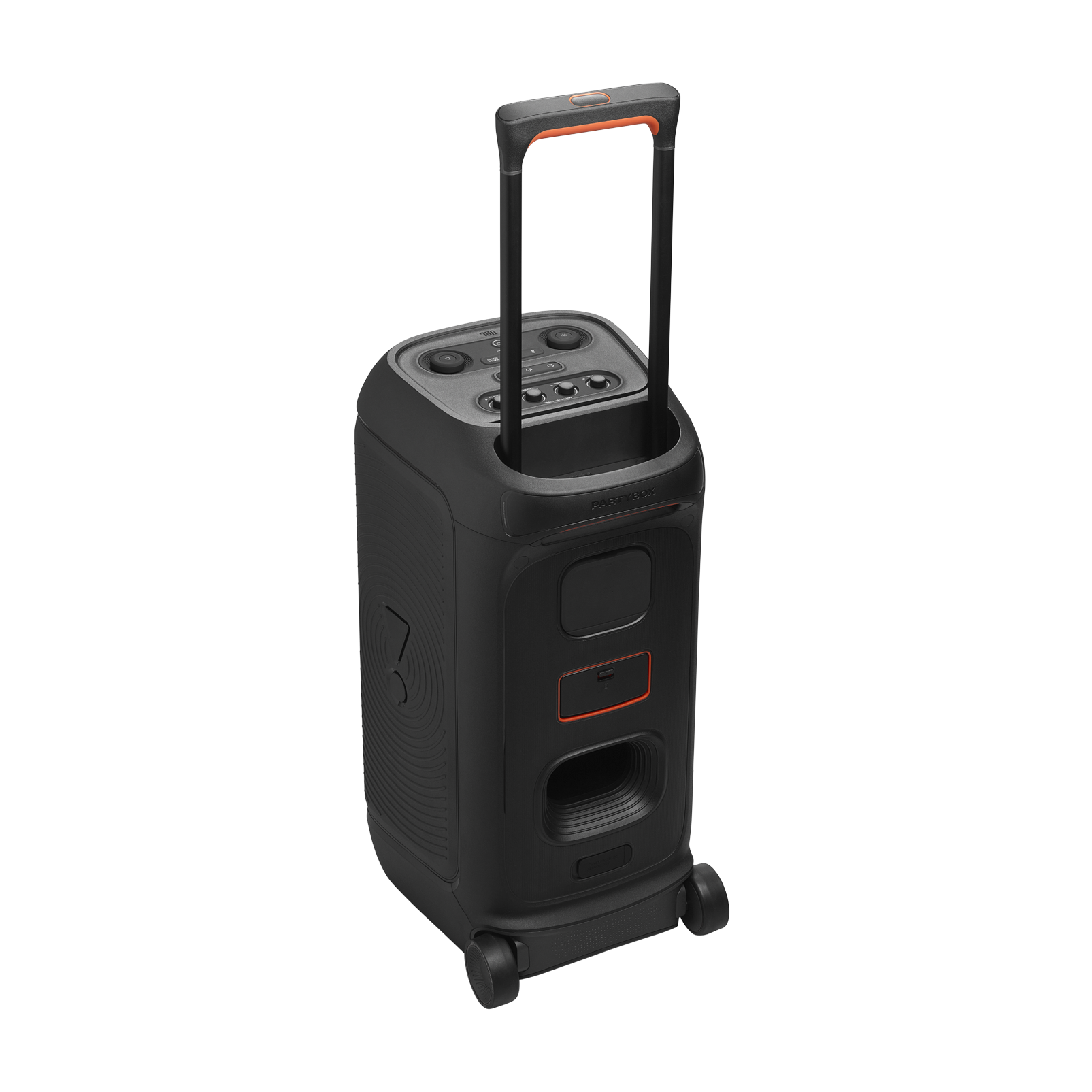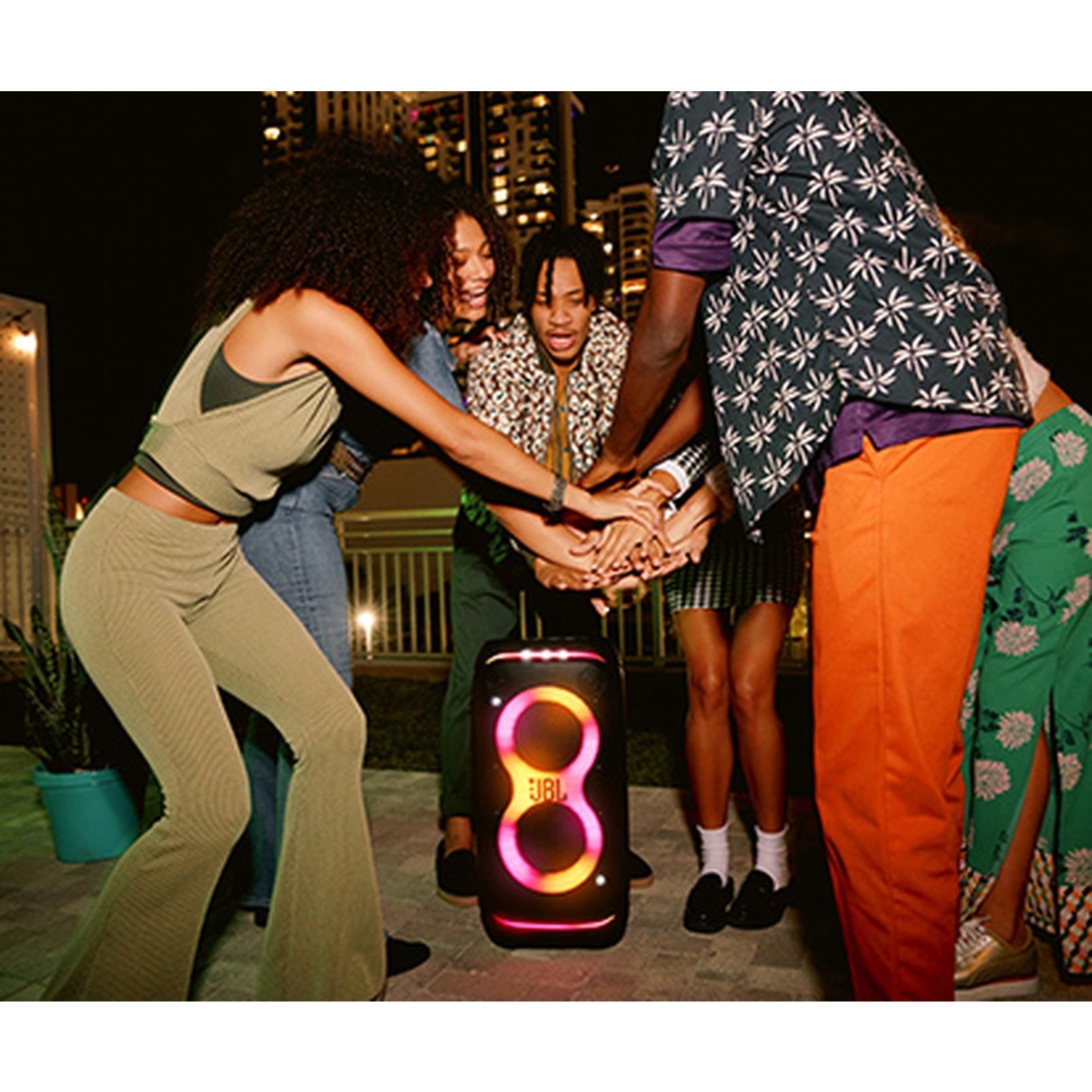 Equipada com um show de luzes RGB futuristas, a PartyBox 320 cria a atmosfera perfeita para qualquer ocasião. Os efeitos são totalmente personalizáveis através do aplicativo JBL PartyBox, permitindo que você escolha a vibe que mais combina com o seu momento.