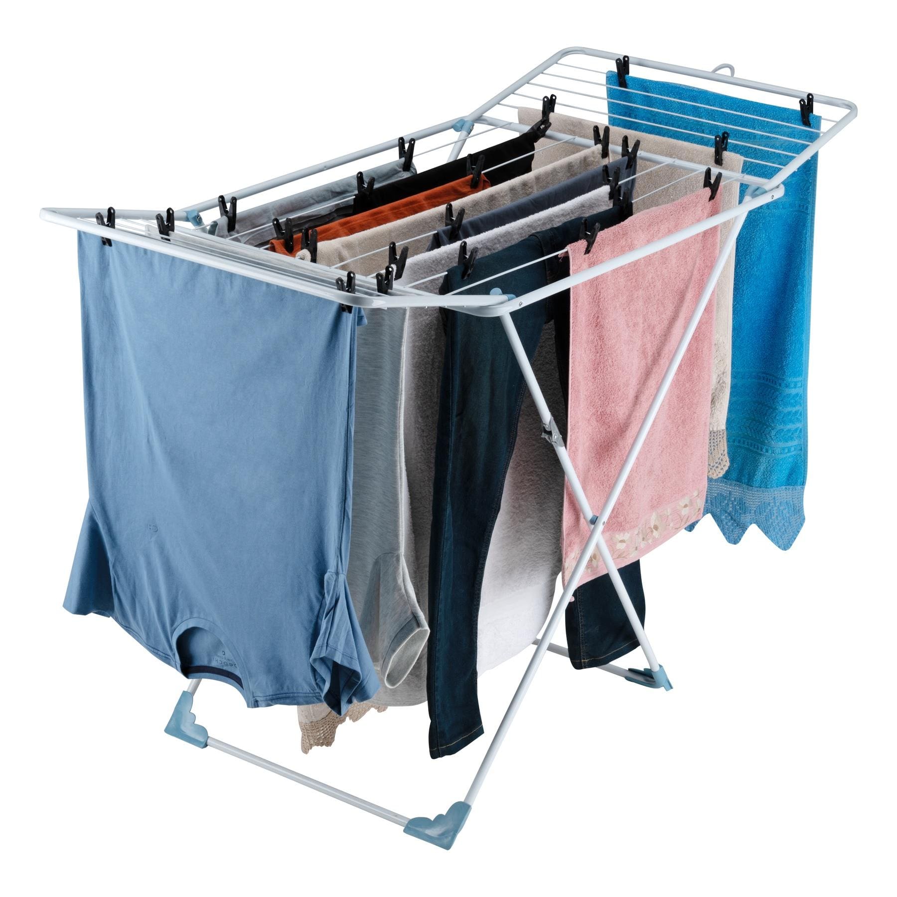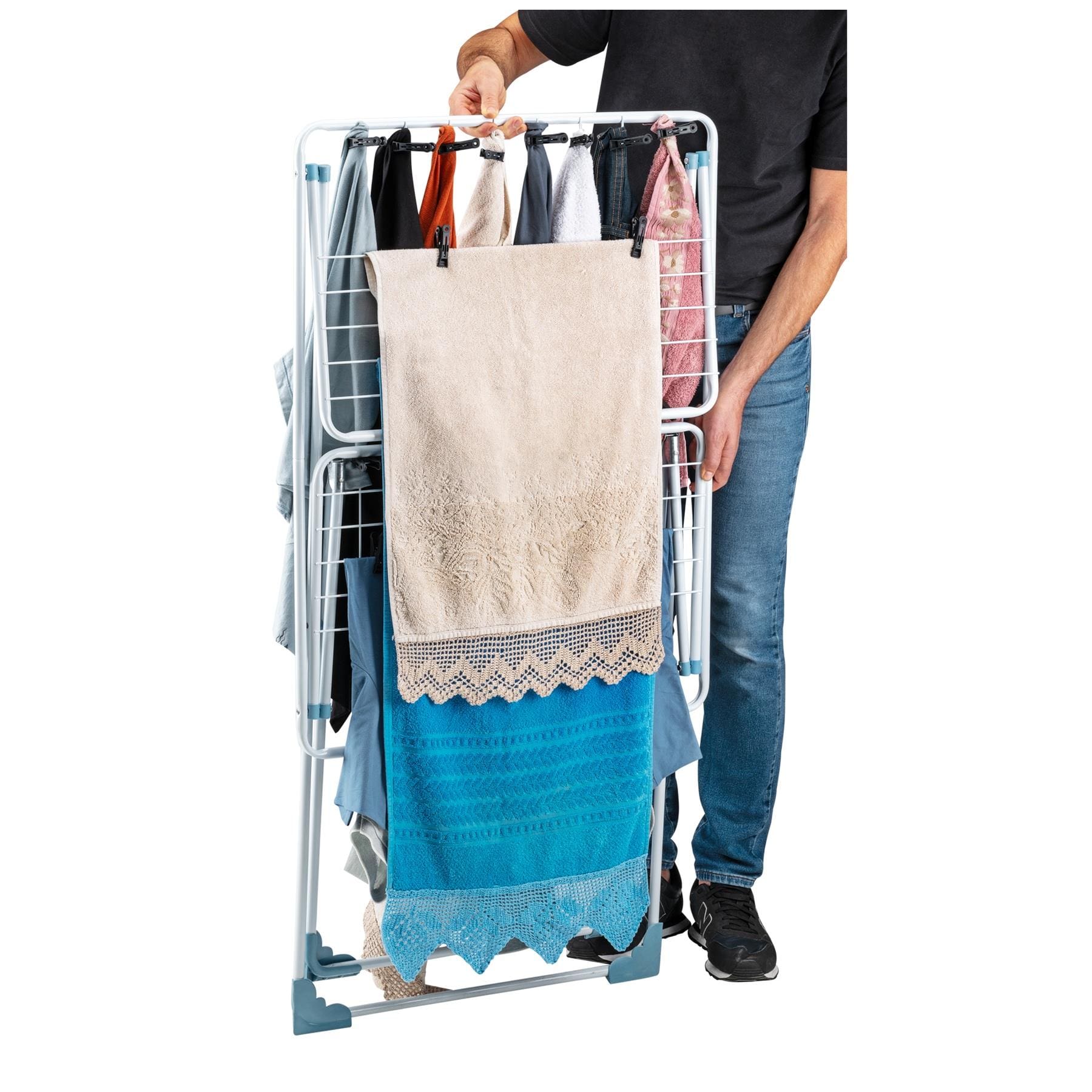 Com dobradiça inteligente, você pode abrir e fechar mesmo com roupas penduradas, facilitando o transporte por portas e corredores. Possui travas nas abas e ponteiras em ângulo de 90º para maior estabilidade, evitando tombamentos.