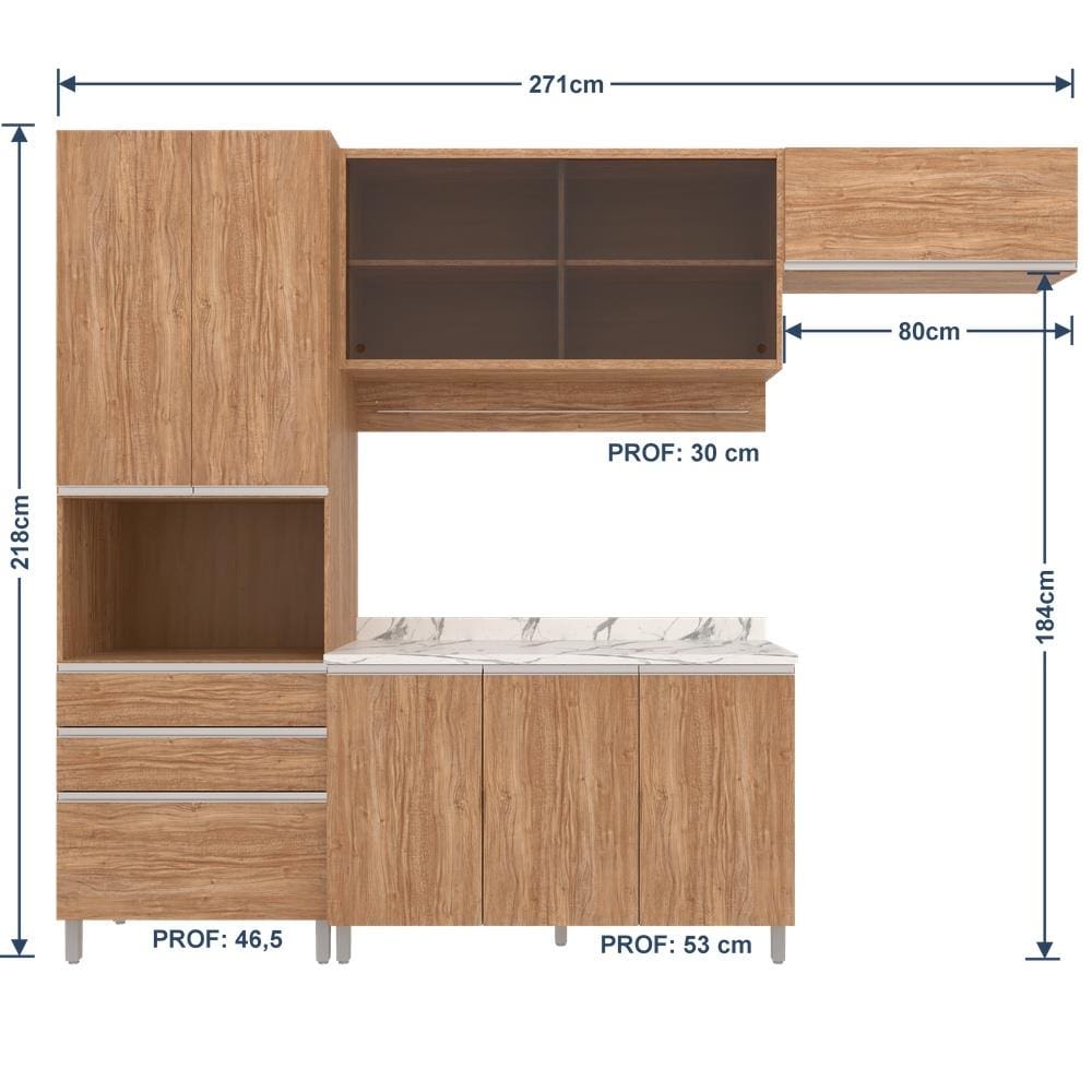 Características Gerais: - Conjunto 4 peças: armário aéreo com vidro, paneleiro, balcão triplo e armário sobre geladeira