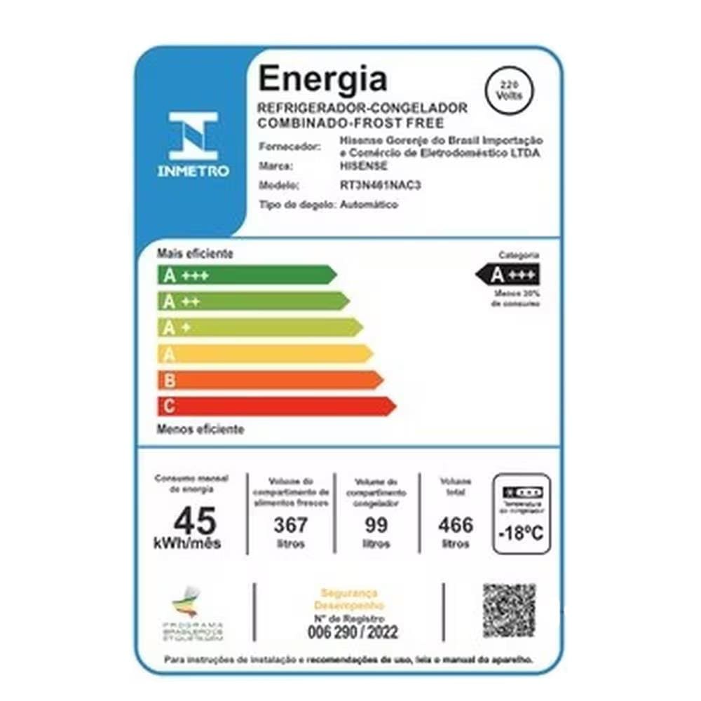 Geladeira Hisense Frost Free Duplex Inverter RT3N461, um refrigerador moderno que une design sofisticado, alta performance e economia. Com 466 litros de capacidade total, pensado para famílias de 6 a 8 pessoas que desejam praticidade no dia a dia sem abrir mão da elegância na cozinha.