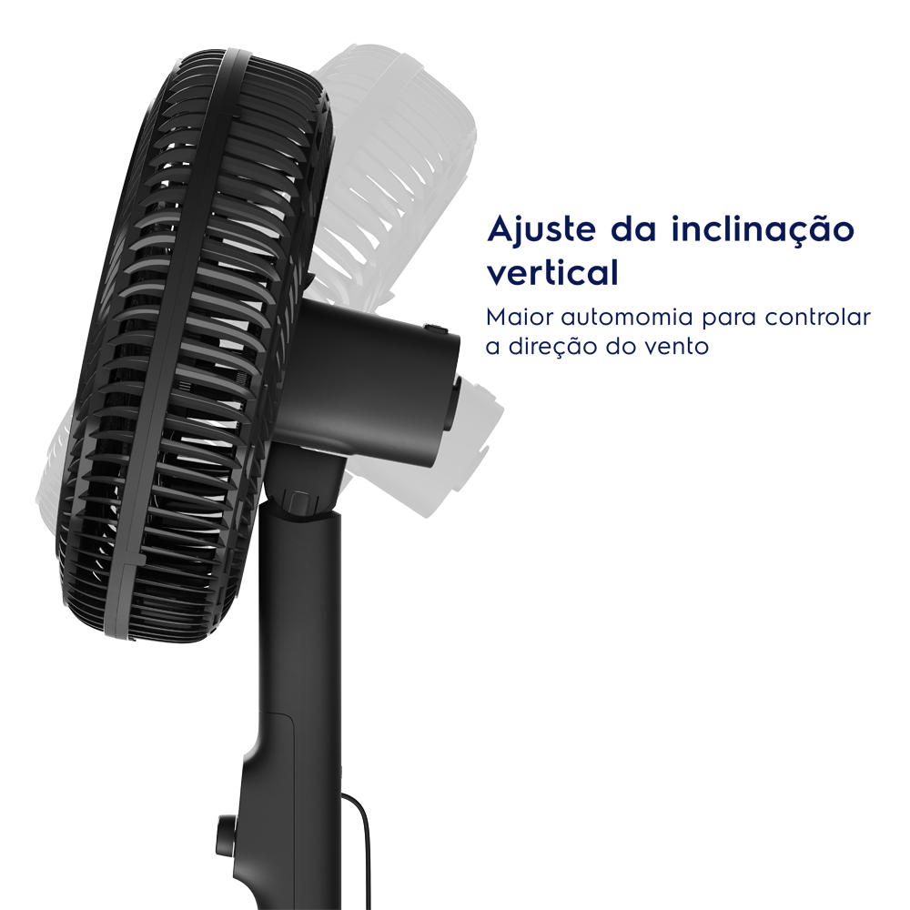 O selo Procel A de eficiência energética garante alto desempenho com baixo consumo, inclusive na velocidade Turbo. São 3 opções de velocidade: Mínima, para operação silenciosa; Média, que reduz o consumo em até 20%; e turbo - para máxima potência de ventilação.A montagem prática com cliques facilita a desmontagem para limpeza ou armazenamento. Conta ainda com ajuste de inclinação vertical e botão oscilante, permitindo direcionar o fluxo de ar de forma fixa ou distribuída lateralmente.