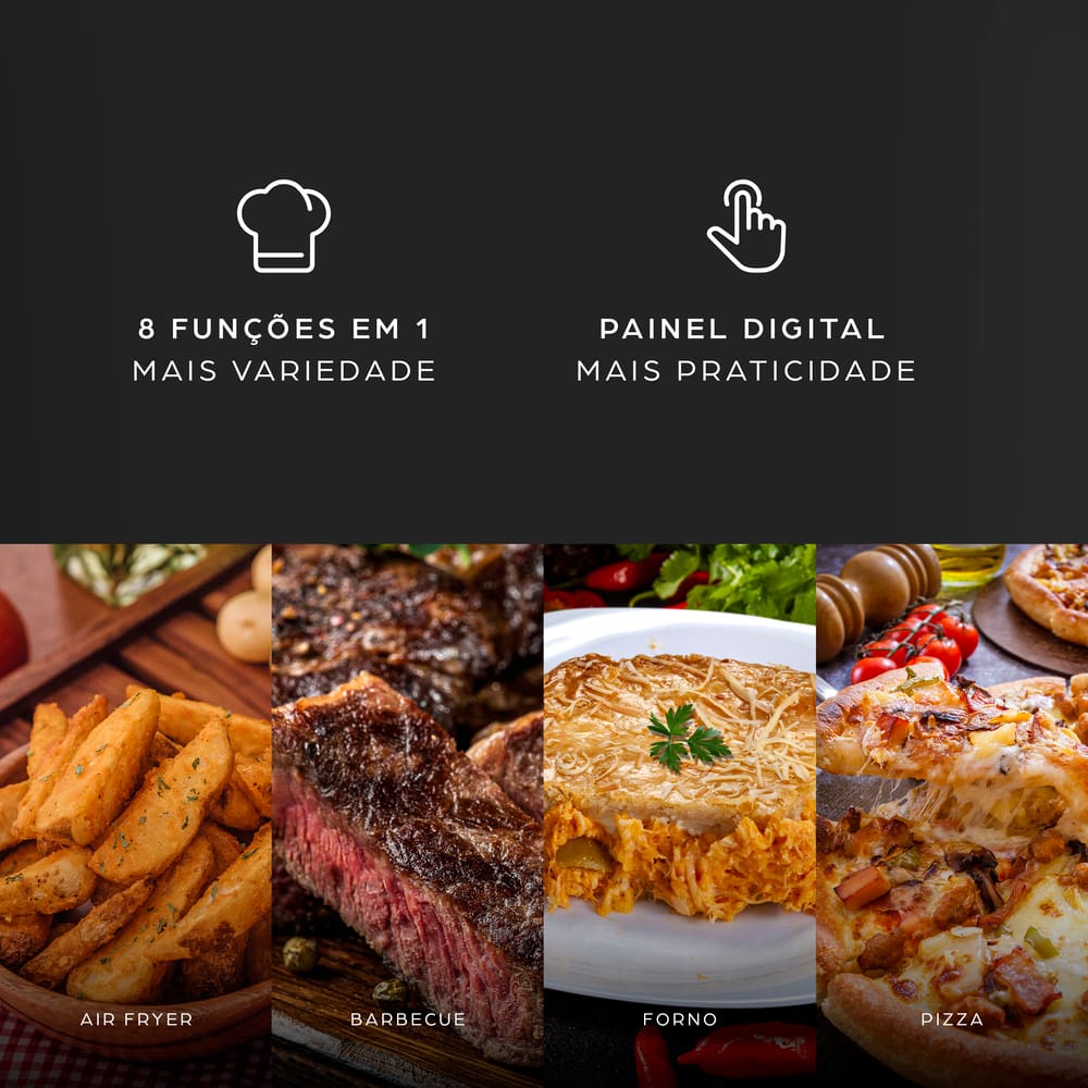 Com Painel Digital e comandos intuitivos, o uso é simples e moderno. O revestimento antiaderente Graystone evita que os alimentos grudem e facilita a limpeza. A Função Pizza amplia ainda mais as possibilidades de preparo, garantindo massas crocantes e recheios bem assados.