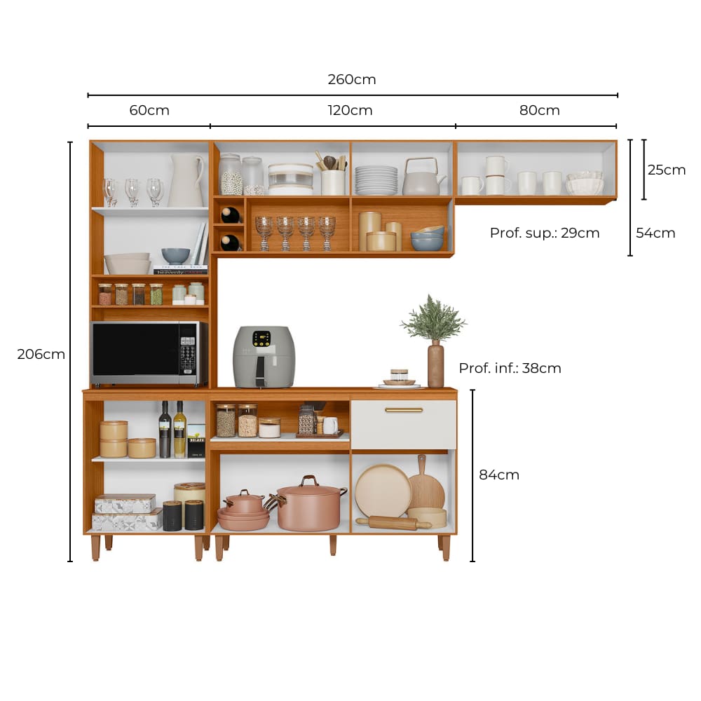O paneleiro conta com nicho decorativo e espaço exclusivo para micro-ondas, otimizando o uso do espaço. O aéreo de 120 cm possui 2 portas, prateleira interna, nicho decorativo e adega para 3 garrafas, unindo charme e funcionalidade. Já o aéreo sobre geladeira pode ser instalado acima do refrigerador ou fogão, oferecendo versatilidade na organização.
