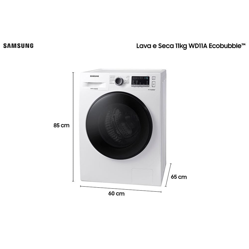 Características Gerais: -Lava e seca suas roupas com maior eficiência, cuidando dos tecidos e economizando água e energia. -Lava, seca e esteriliza a seco - 3 em 1 Roupas sempre bem cuidadas com a lavadora que lava, seca e esteriliza a seco. Com o ciclo de lavagem a seco, você elimina odores indesejáveis e até 99,9% das bactérias e alérgenos que causam problemas respiratórios, sem usar água ou sabão. Ideal para proteger sua saúde e a da sua família. -Bolhas poderosas - Ecobubble™ A tecnologia exclusiva Ecobubble™ produz bolhas de sabão que tornam a lavagem muito mais cuidadosa e poderosa. Ela facilita em 40x a penetração do sabão no tecido e promove uma lavagem mais eficaz mesmo com água fria e com mais economia de energia. -Eficiência energética, mais silenciosa e 20 anos de garantia no motor - Digital Inverter Mais economia de energia e muito menos barulho ao lavar suas roupas, além dos 20 anos de garantia no motor com a tecnologia Digital Inverter da Samsung. -Praticidade e rapidez - Lavagem rápida em 15min e Lava e Seca em 59min A WD11A lava e centrifuga as roupas em 15min no ciclo rápido destinado a pequenas cargas, com sujeira leve. Ela ainda possui um ciclo de lavagem e secagem de 59min para garantir mais praticidade e tempo pra você. -Limpeza profunda com vapor eliminando 99,9% de bactérias - Vapor de higiene Higienize suas roupas com o poderoso ciclo de vapor que libera ar quente, removendo sujeiras profundas e 99,9% das bactérias e alérgenos inativos. -Sua máquina sempre limpa - Lavagem do Tambor Eco Mantenha sua máquina limpa de maneira ecológica. A Lavagem do Tambor Eco remove 99,9% das bactérias causadoras de odor do tambor sem usar produtos químicos e ainda ajuda na manutenção do seu produto. E você ainda recebe uma notificação de quando a sua máquina precisa ser limpa. -Delicadeza para proteger os tecidos - Diamond Drum O design do tambor da lava e seca Samsung é delicado com as suas roupas. Os pequenos relevos em formato de diamante do tambor também ajudam a proteger os tecidos, reduzindo o atrito e prevenindo que suas roupas desfiem durante a lavagem. -Lavagem intensiva para as manchas mais difíceis - Função Manchas Difíceis A função Manchas Difíceis ajuda a remover uma grande variedade das manchas mais difíceis. Ao selecionar essa função, as peças de roupas são colocadas completamente de molho em água com bolhas para uma lavagem mais eficaz. -Remove os resíduos - Dispenser sempre limpo O dispenser projetado com um sistema de passagem de água facilita a saída do sabão, mantendo-o limpo e evitando desperdício de insumos. Outras especificações: -Sensor de Carga; -Entrada de água: 1 Via; -Número de ciclos: 12; -Enxágues: Automático ou Personalizável; -Cabo/Plugue: tripolar (INMETRO); -Cor gabinete: branco; -Cor da porta: preta; -Cor do display: Preto.