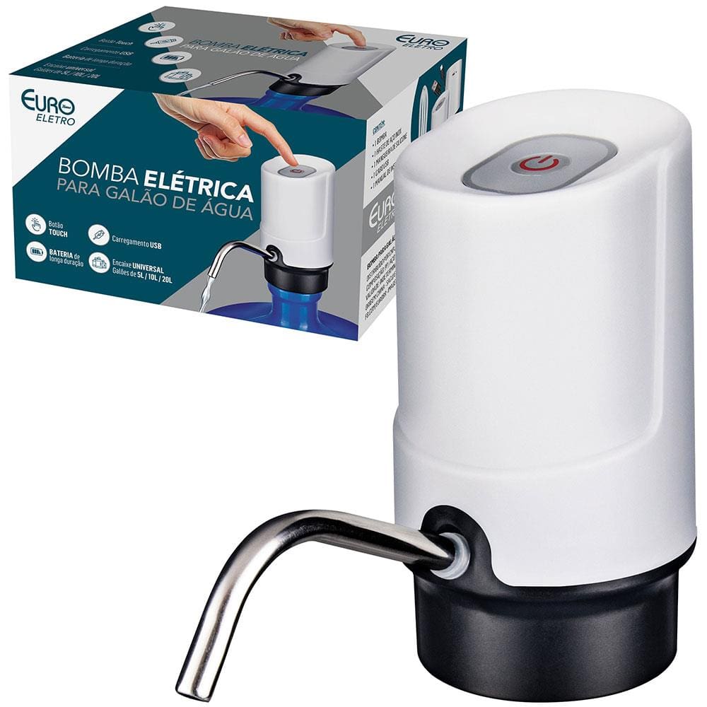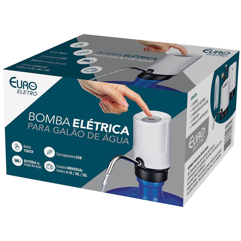 Conteúdo da Embalagem: - 1 Bomba elétrica para galão de água Euro (medidas: 16cm x 7,1cm x 13cm)