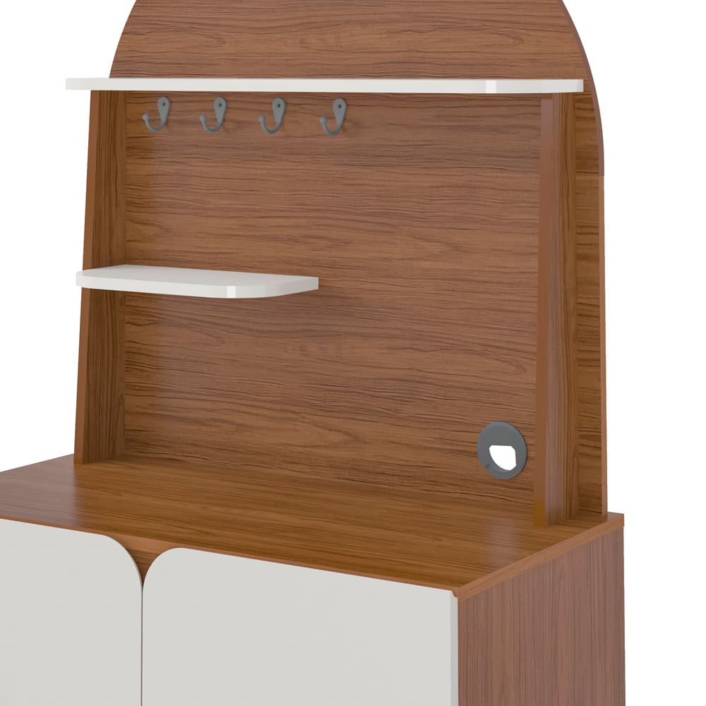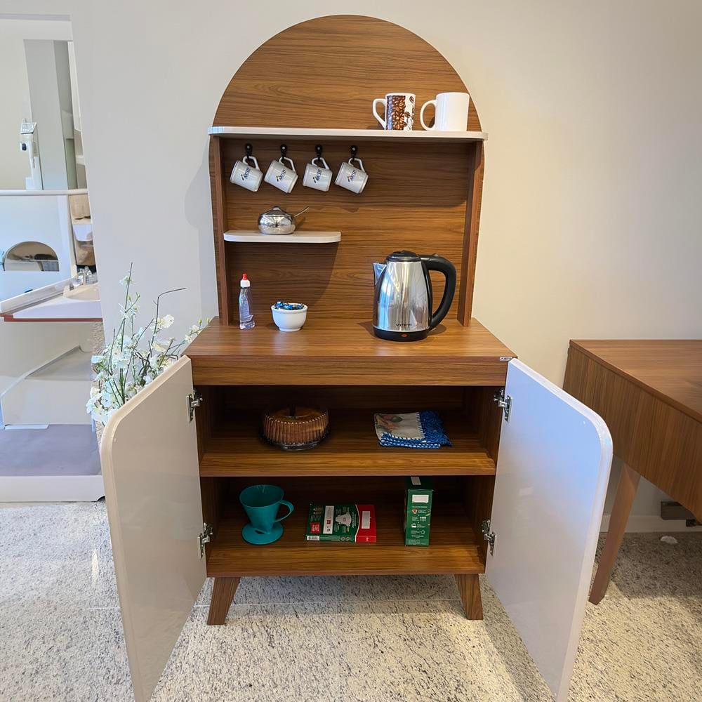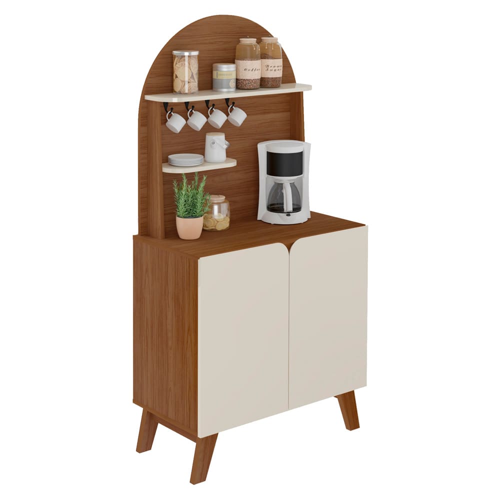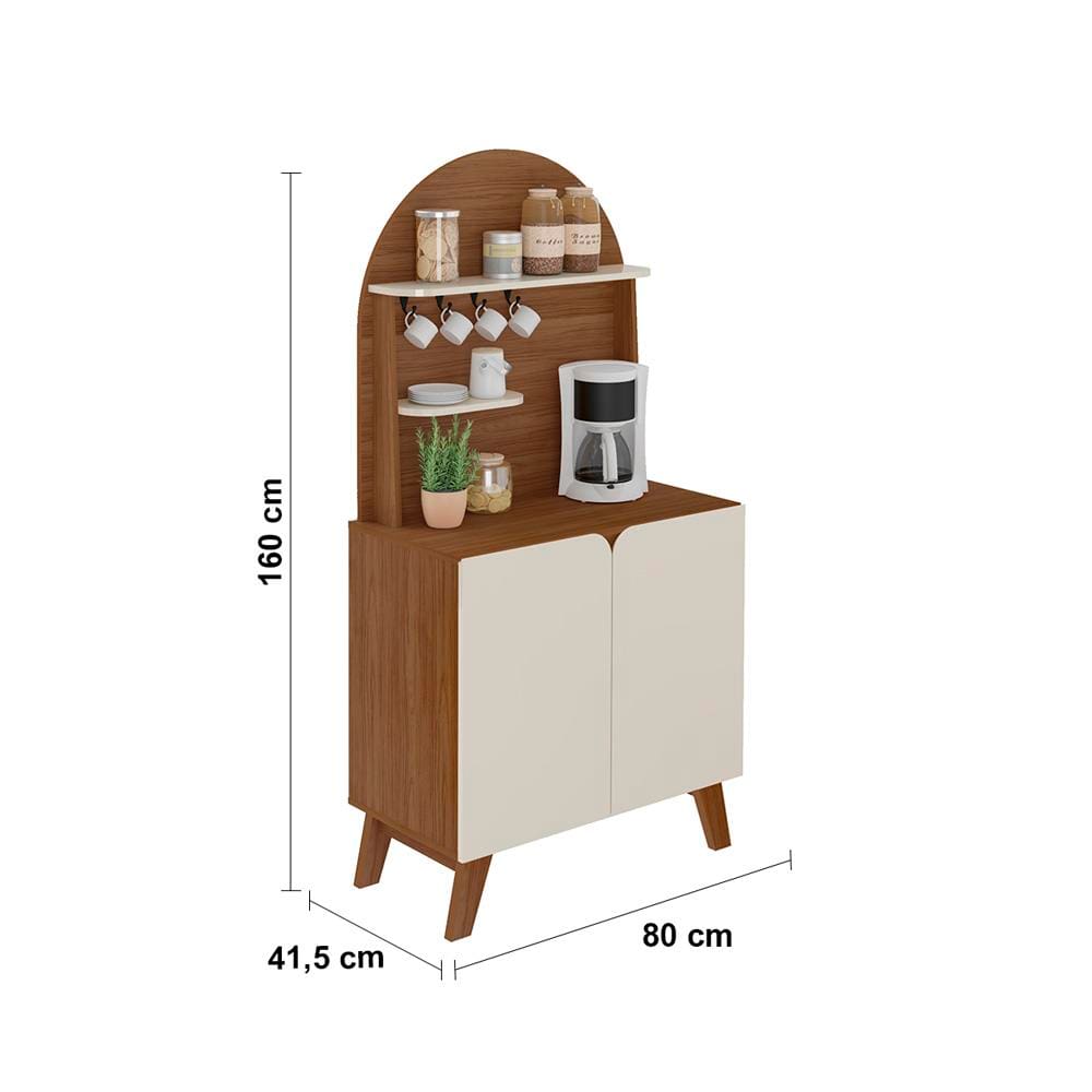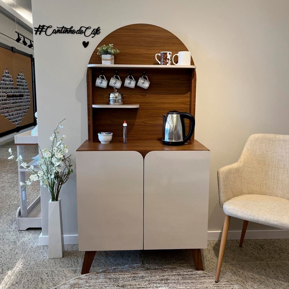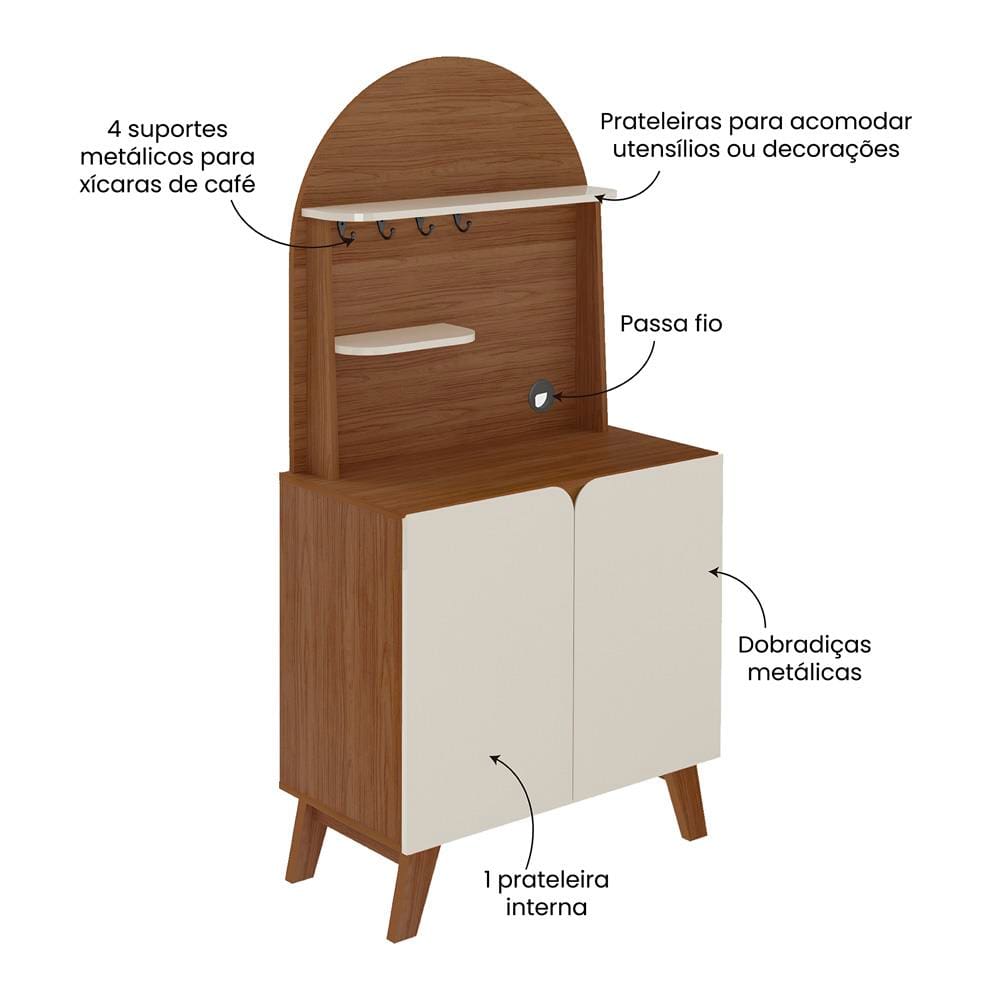 Prático e charmoso, o suporte para xícaras mantém suas xícaras sempre à disposição, facilitando o momento do café e adicionando um toque decorativo ao móvel. As prateleiras superiores são ideais para exibir itens decorativos ou armazenar utensílios, permitindo personalizar o seu cantinho do café de acordo com suas necessidades.