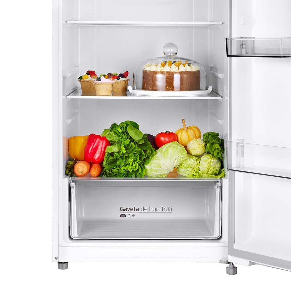 Mantenha suas frutas, legumes e verduras frescos por mais tempo na gaveta hortifruti, especialmente projetada para armazenagem prática. As prateleiras de vidro, além de elegantes, facilitam a limpeza e a organização do interior da geladeira.