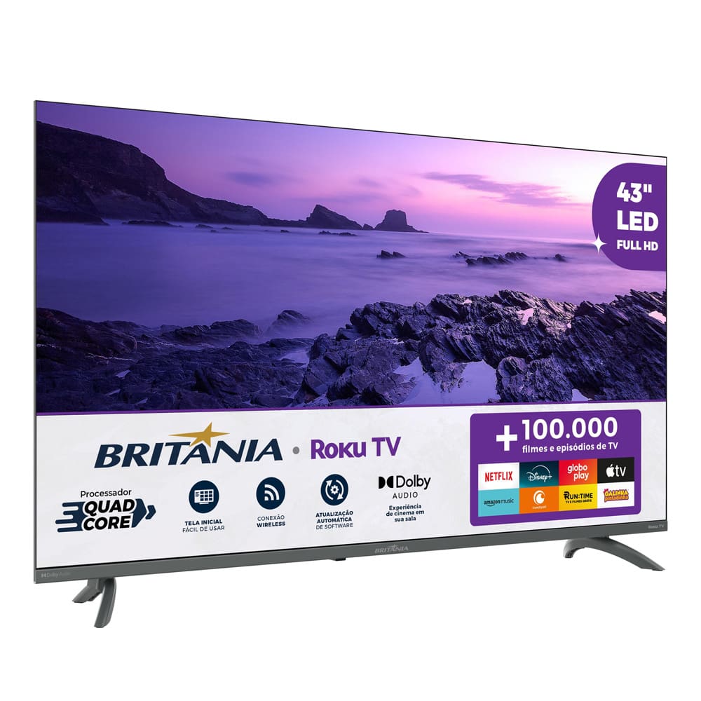 Observações: -ATENÇÃO: O item é composto APENAS pela Smart TV DLED 43" Full HD Britânia BTV43VA4REGB Roku TV com HDMI, USB, Wi-Fi, Dolby Audio, Processador Quad-Core e Conexão com Alexa. Os demais componentes nas imagens são apenas ilustrativos.