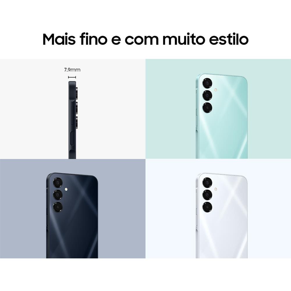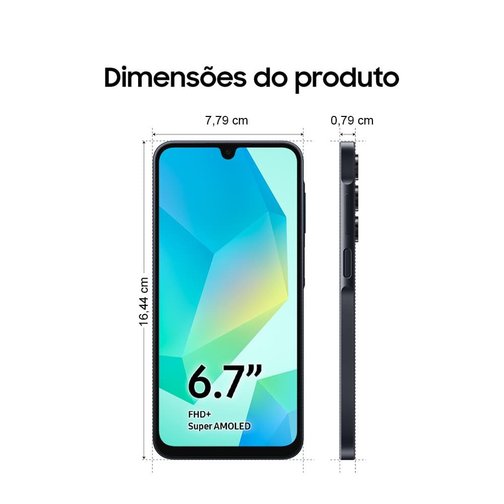 O Samsung Galaxy A16 combina funcionalidade e visual refinado. Com apenas 7,9 mm de espessura, o modelo encaixa-se perfeitamente na mão e acompanha você com conforto e estilo no dia a dia. Disponível na cor azul escuro, ele chama atenção pelo acabamento moderno e minimalista. A versão tradicional em preto também mantém o padrão de elegância, entregando um visual sóbrio e sofisticado que combina com qualquer ocasião.