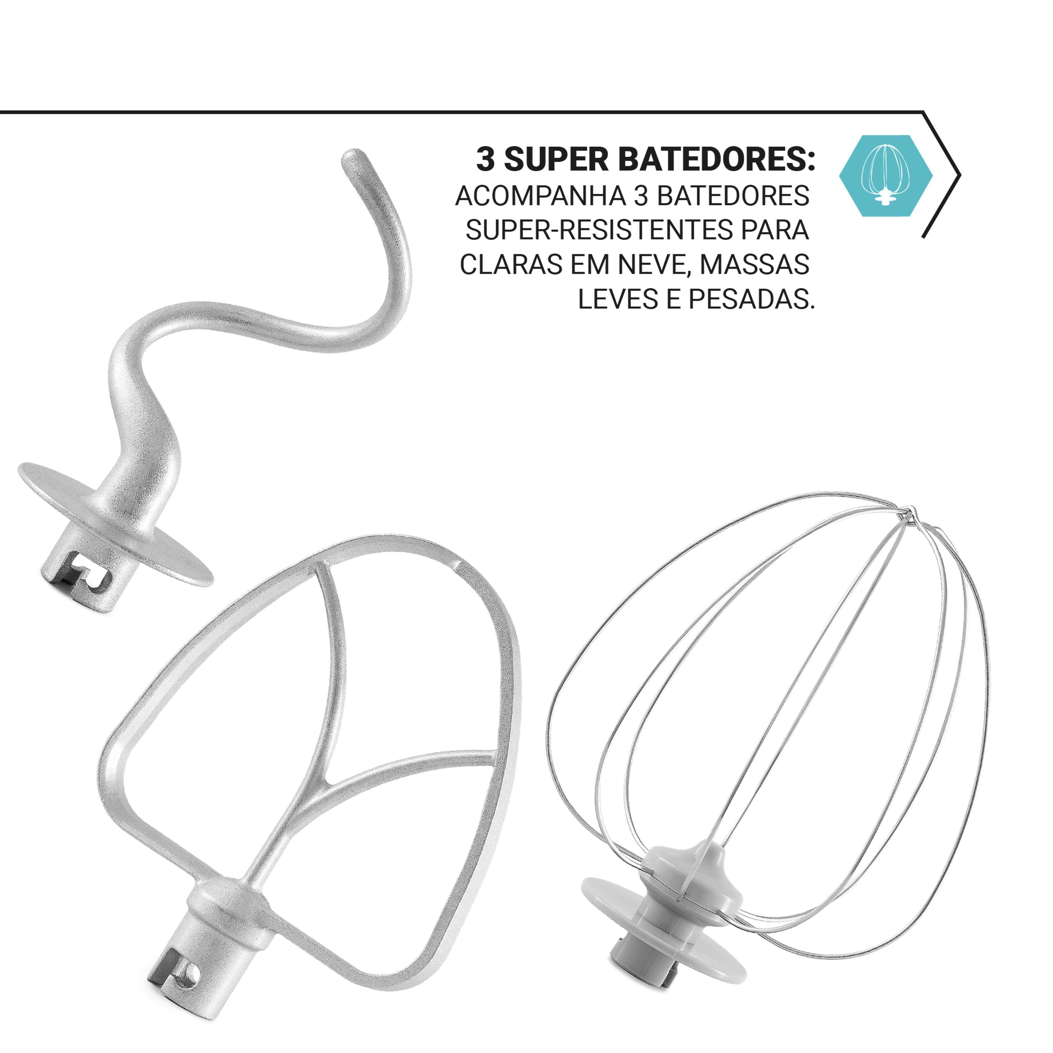 Inclui 3 batedores: para massas pesadas, massas leves e clara em neve. A tigela com 5L de capacidade é perfeita para preparar grandes receitas, e a tampa antirrespingo evita sujeiras pela cozinha, permitindo adicionar ingredientes durante o funcionamento sem fazer bagunça.Eu quero