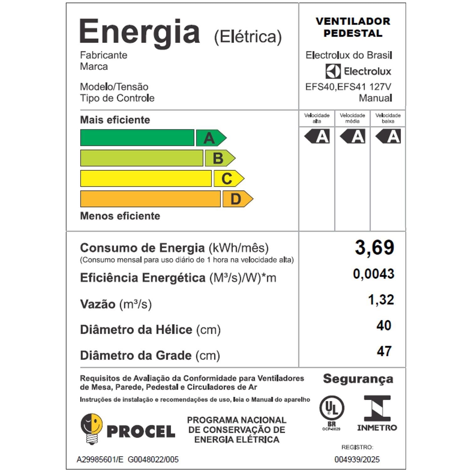 O selo Procel A de eficiência energética garante alto desempenho com baixo consumo, inclusive na velocidade Turbo. São 3 opções de velocidade: Mínima, para operação silenciosa; Média, que reduz o consumo em até 20%; e turbo - para máxima potência de ventilação.A montagem prática com cliques facilita a desmontagem para limpeza ou armazenamento. Conta ainda com ajuste de inclinação vertical e botão oscilante, permitindo direcionar o fluxo de ar de forma fixa ou distribuída lateralmente.
