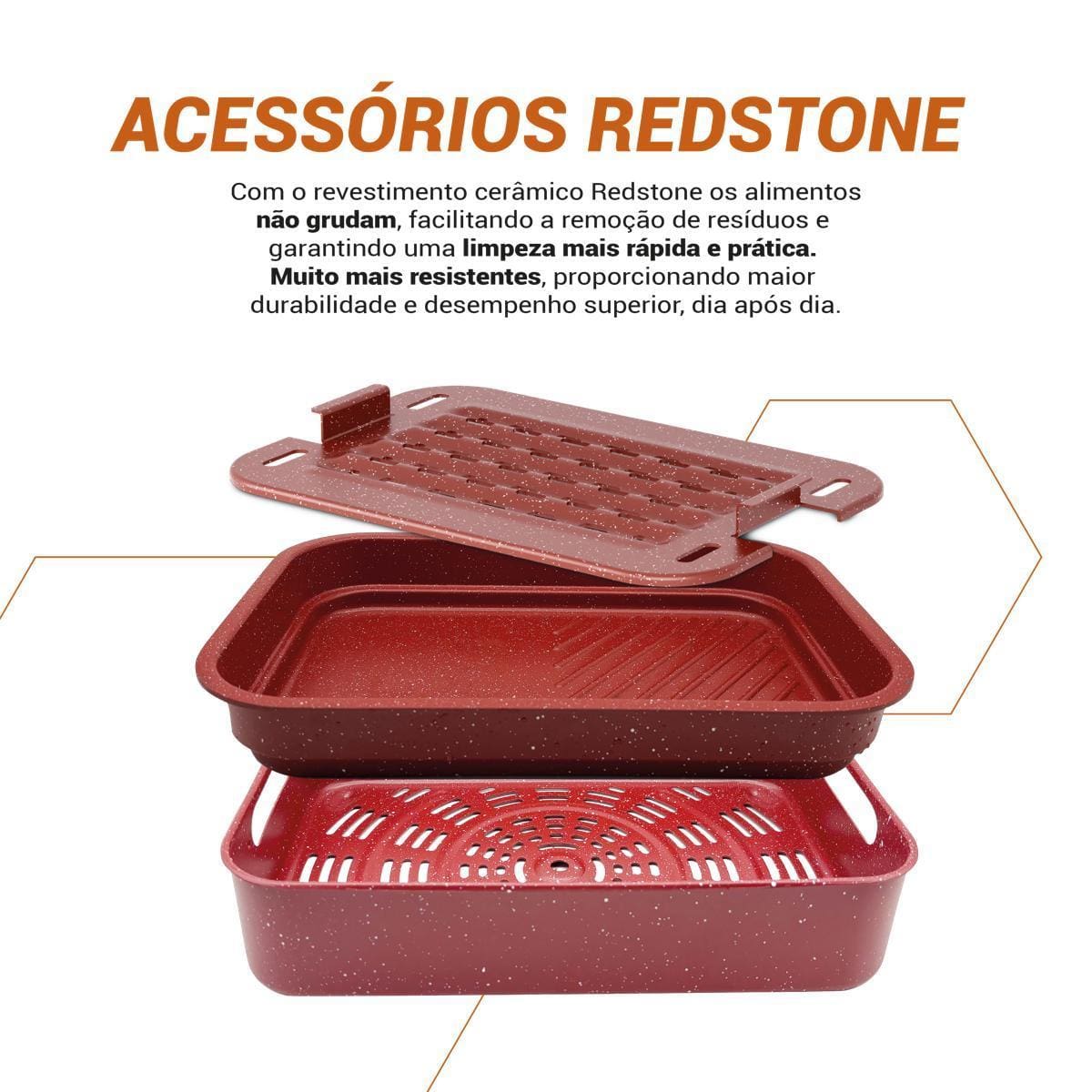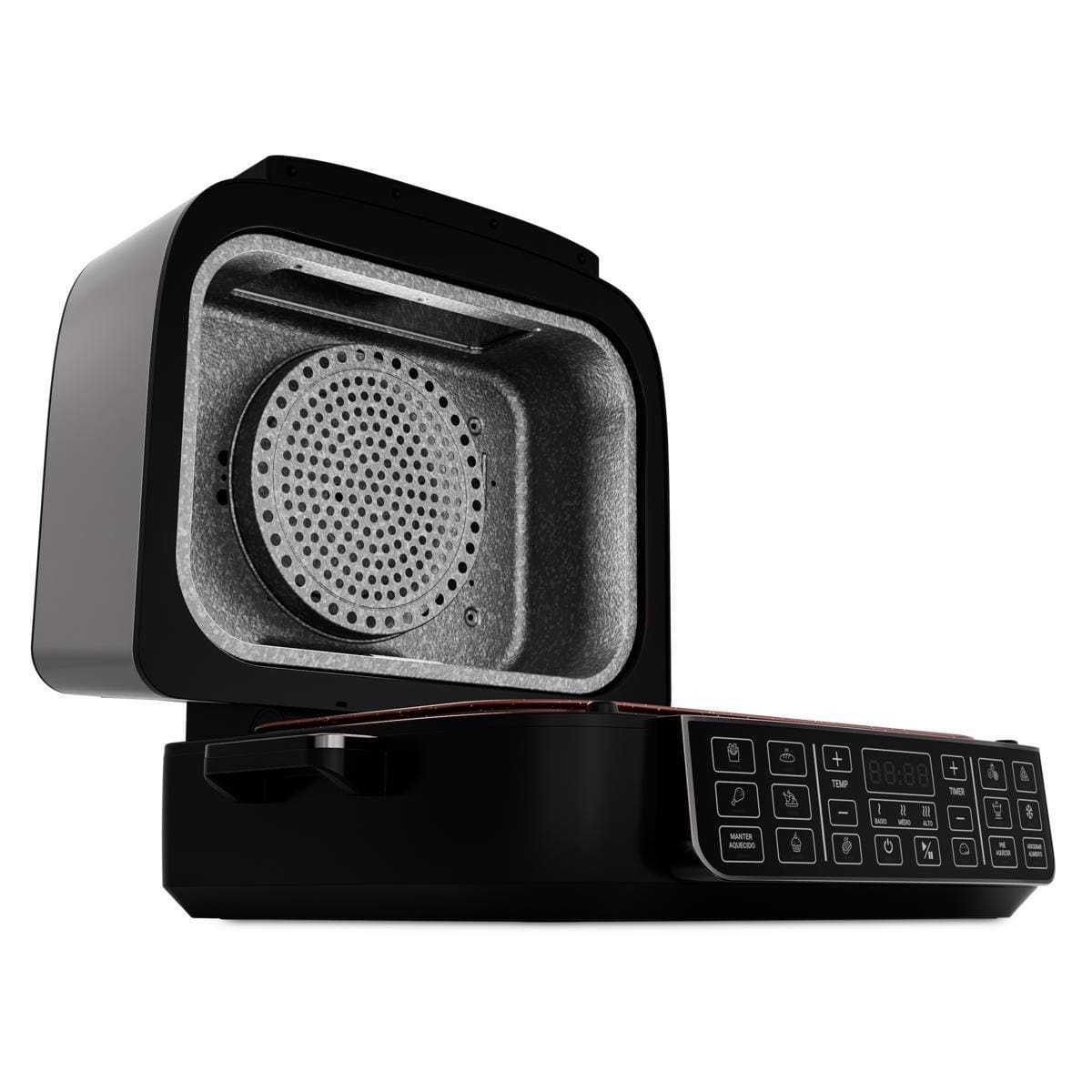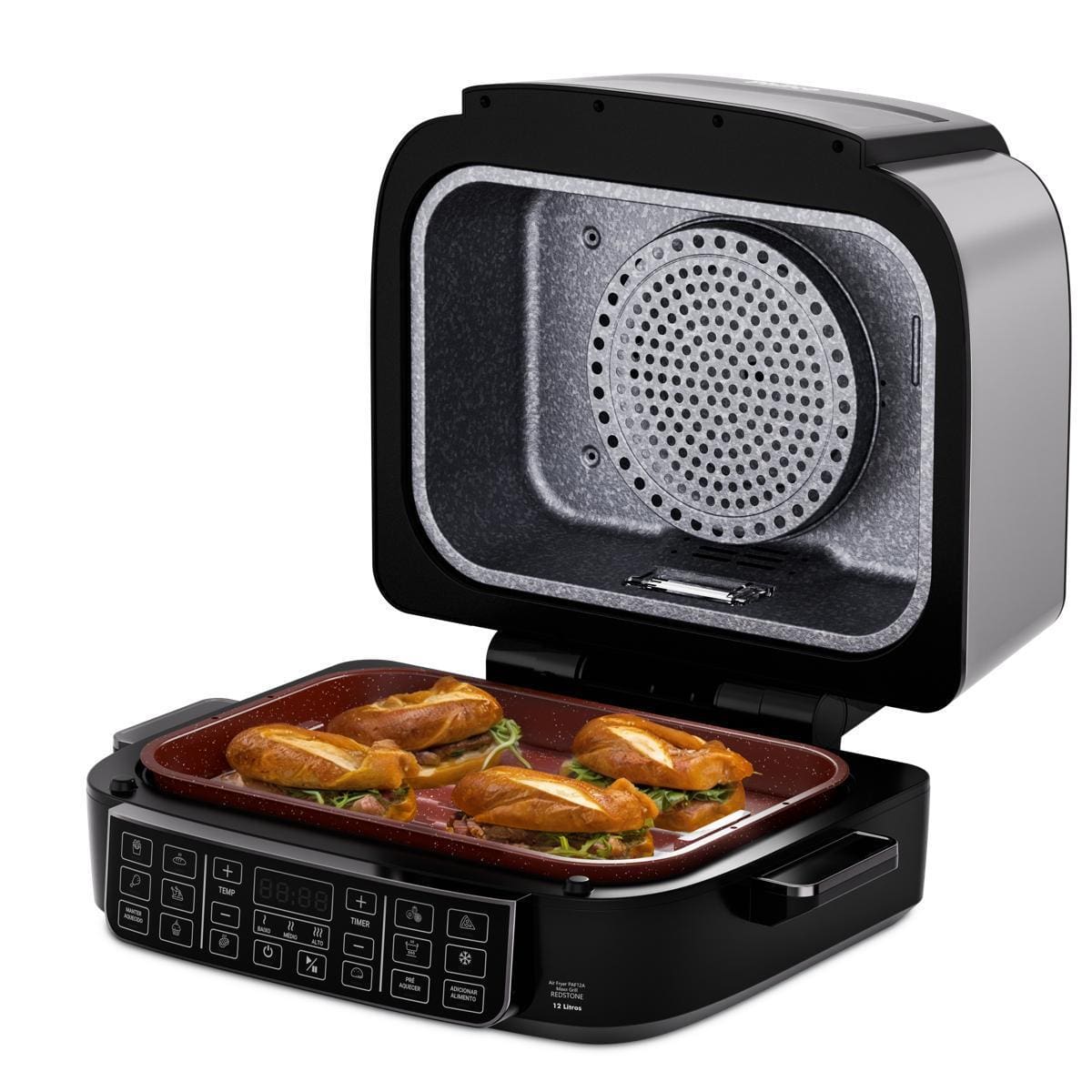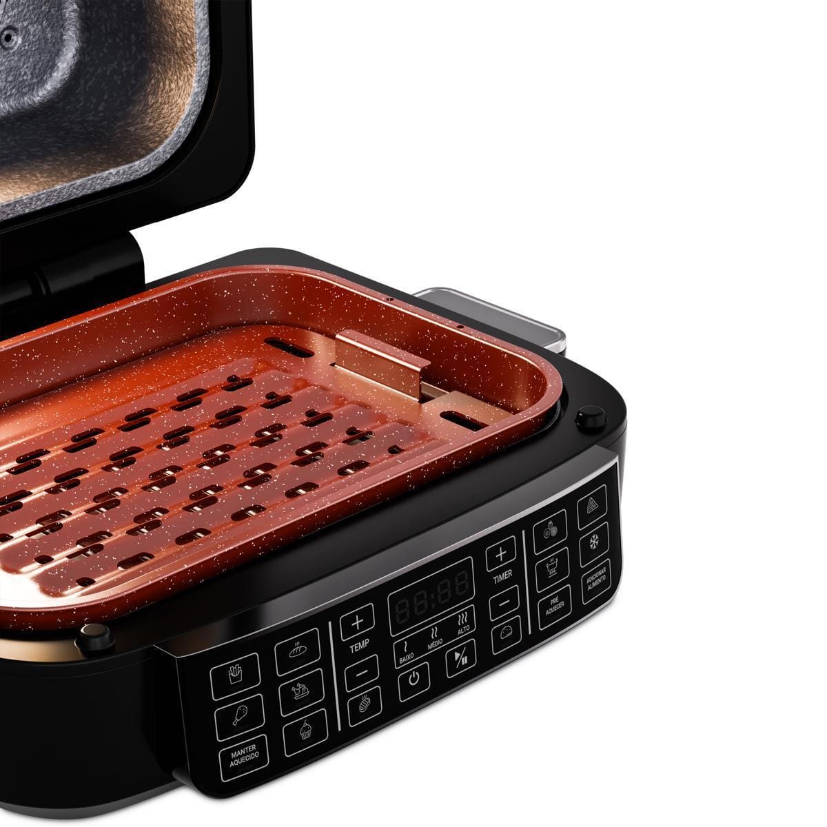 Com funções especiais para desidratar e descongelar alimentos, você prepara snacks saudáveis ou agiliza receitas com praticidade. Acompanha refratário versátil, perfeito para bolos e pizzas, além de grelha e cesto removíveis com revestimento antiaderente Redstone.