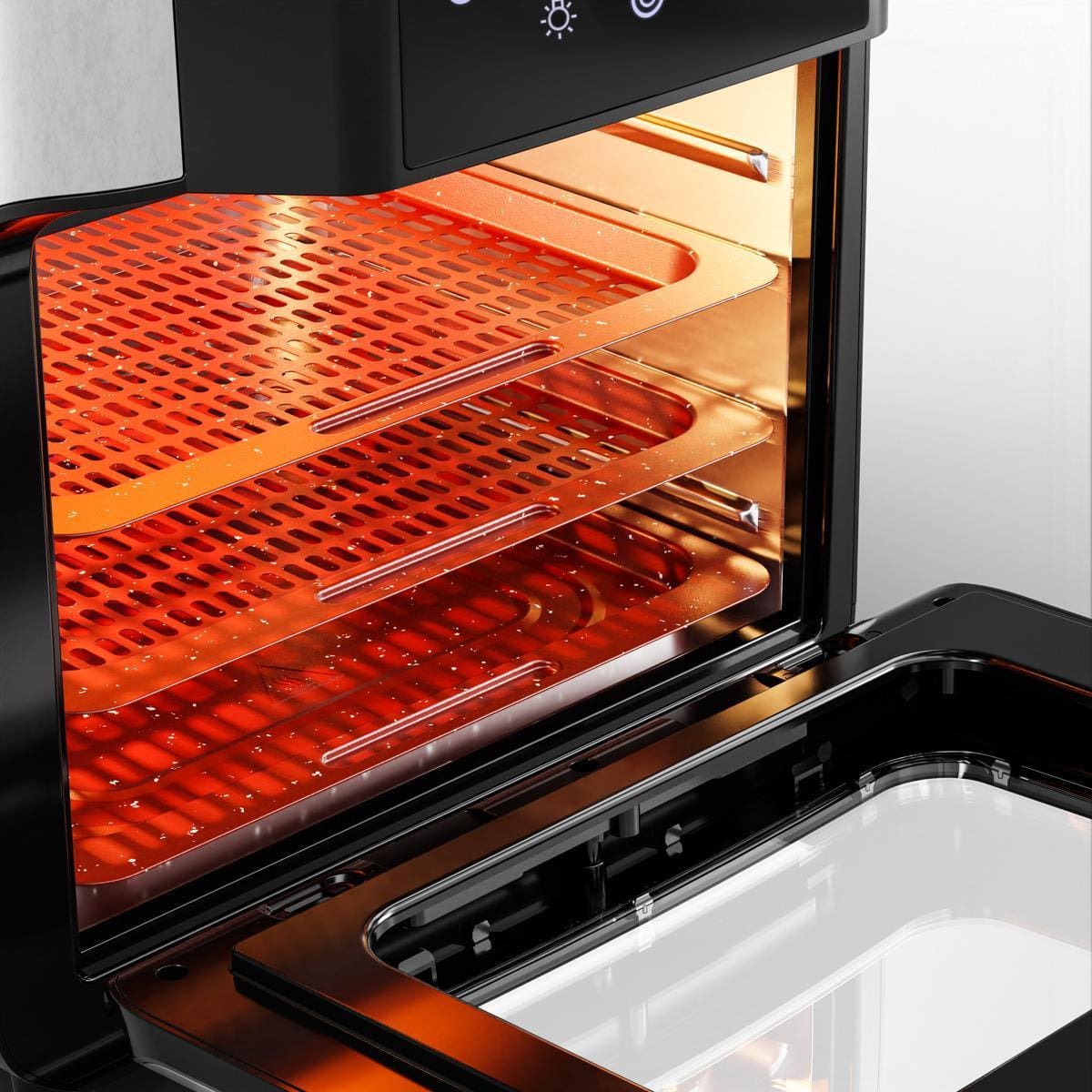 A porta removível facilita a higienização, enquanto os acessórios inclusos — cesto de 5,5L, bandeja coletora e 2 grelhas — oferecem versatilidade para inovar nas receitas. Com o visor Glass, você acompanha tudo sem abrir o aparelho.