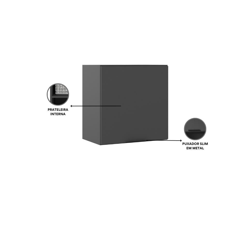 Características Gerais: - Armário Aéreo de Cozinha Poliman Etna - Tipo: Armário aéreo - Largura: 58 cm - 1 Porta de bater - 1 Prateleira interna fixa - Dobradiças: Reforçadas 35mm - Puxador: Metal preto - Estrutura: MDP 15mm / HDF 3mm - Pintura: UV acetinada - Tipo de instalação: Parede - Cor: Grafite