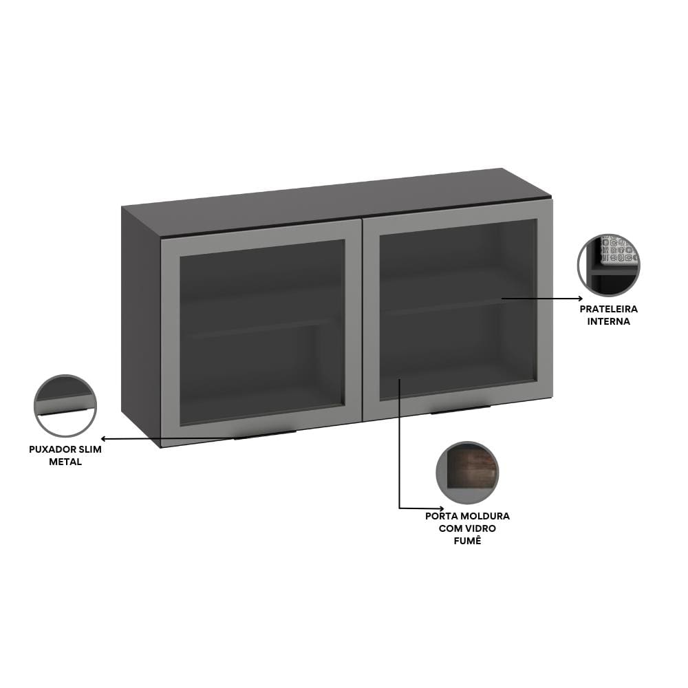 Armário Aéreo de Cozinha Poliman Etna 120cm 2 Portas de Vidro Grafite
