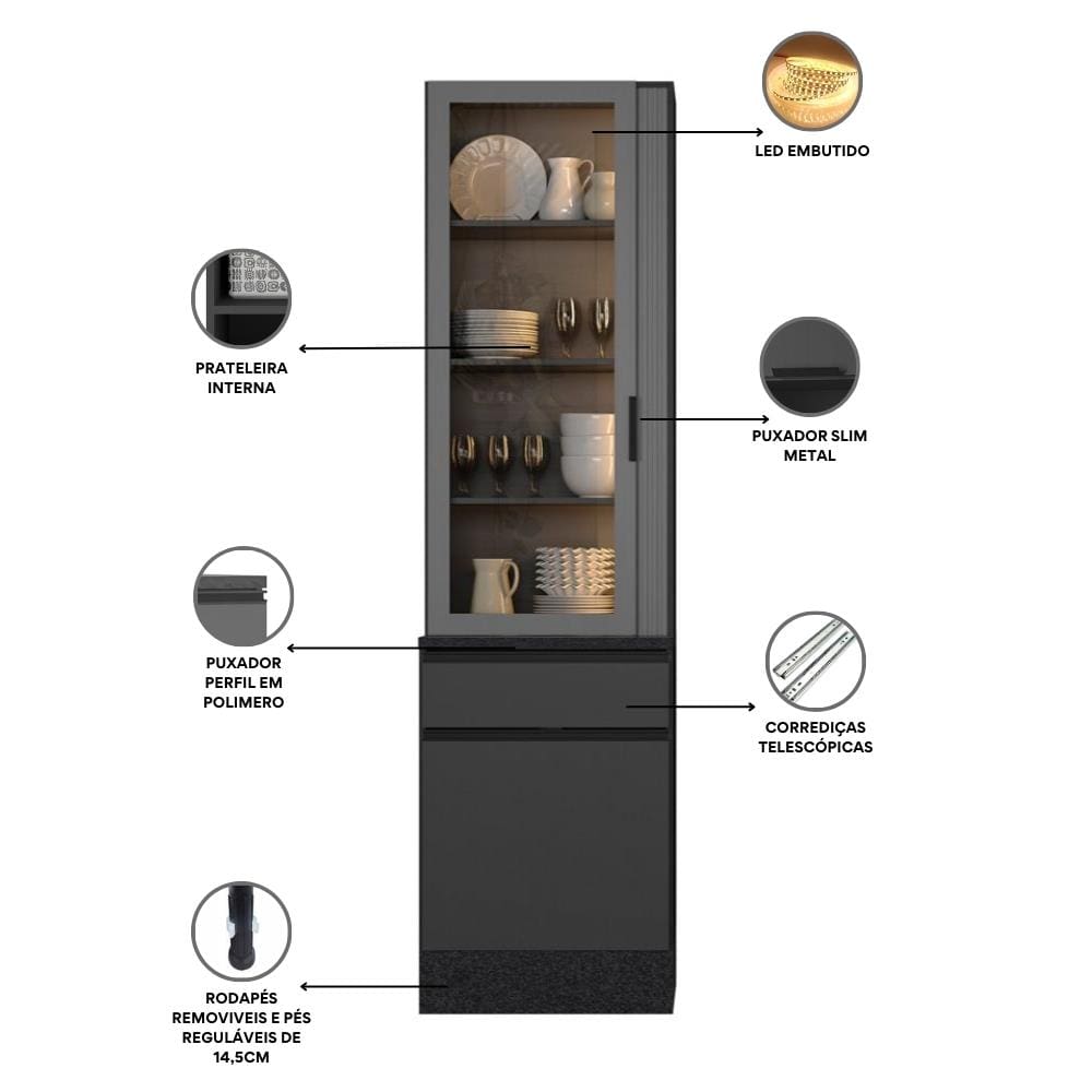 Os puxadores perfil em polímero na parte inferior e o puxador em metal preto na parte superior complementam o design contemporâneo. Os pés em PVC reguláveis de 14,5cm permitem o nivelamento perfeito ao piso, além de acompanhar rodapés com presilhas modelo click para fácil remoção.