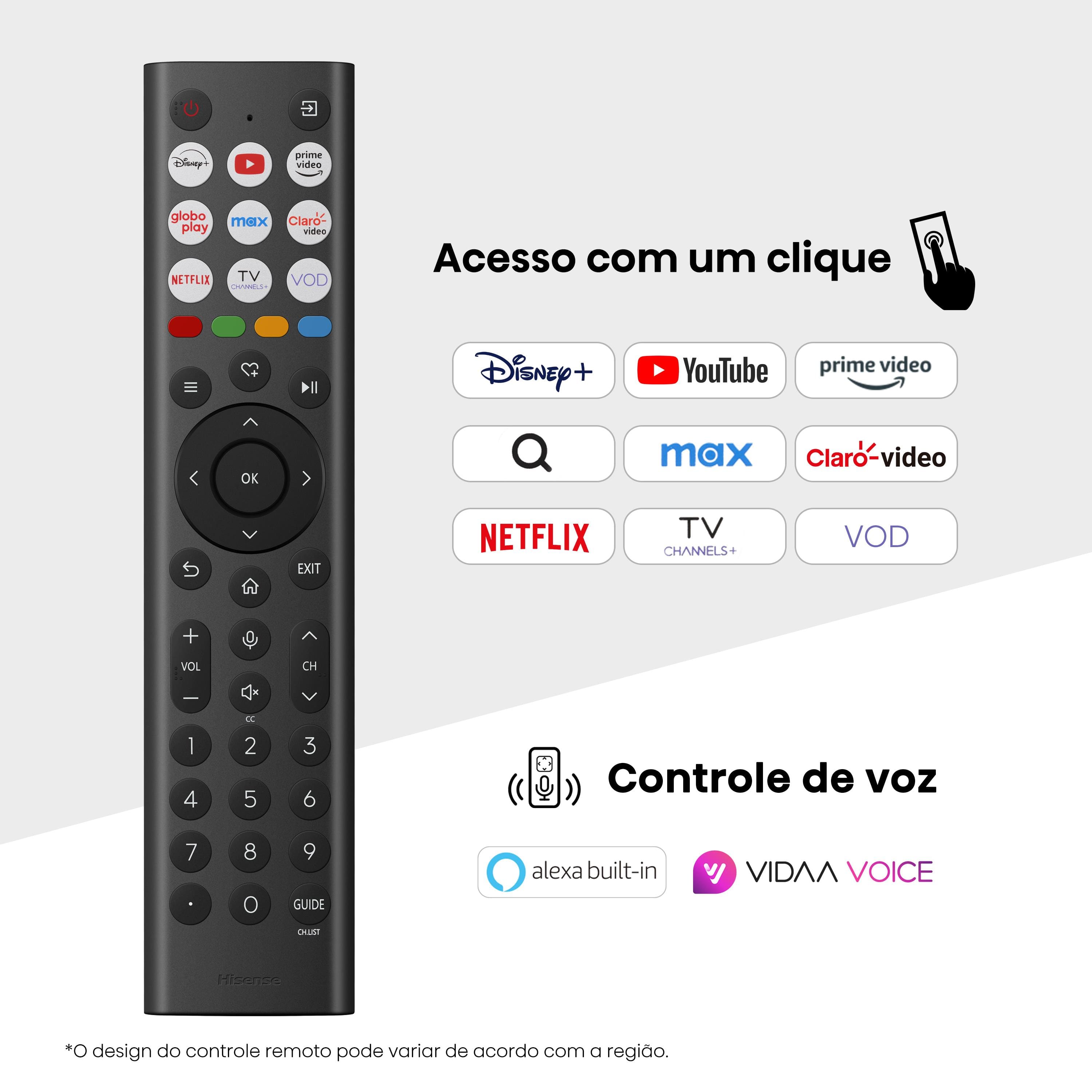 O sistema operacional Vidaa oferece navegação rápida e intuitiva, com Wi-Fi integrado, espelhamento via MiraCast e compatibilidade com Alexa e Google Assistente, facilitando o controle da TV no dia a dia.